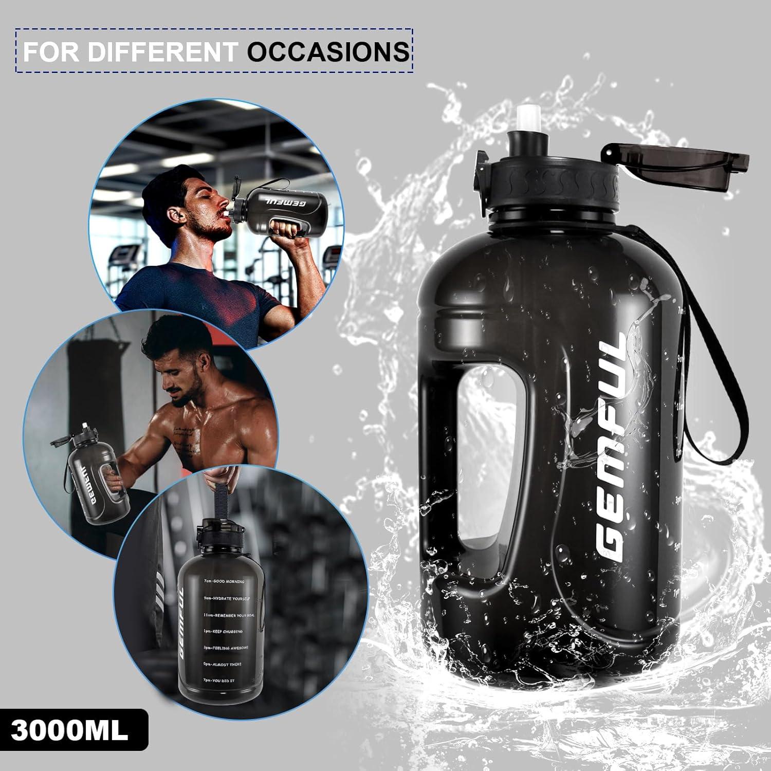 GEMFUL 2L Leak Proof Water Bottle with Handle 64oz Large Gym Jug Time Marker No Straw BPA Free Motivational for Men & Women (Royal Blue)(3L Black with Straw)